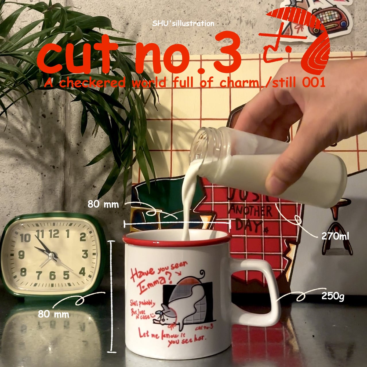 手描きラインと赤いリムがアクセントになっていて、朝のコーヒーや夜のミルクにもぴったりのサイズ感。